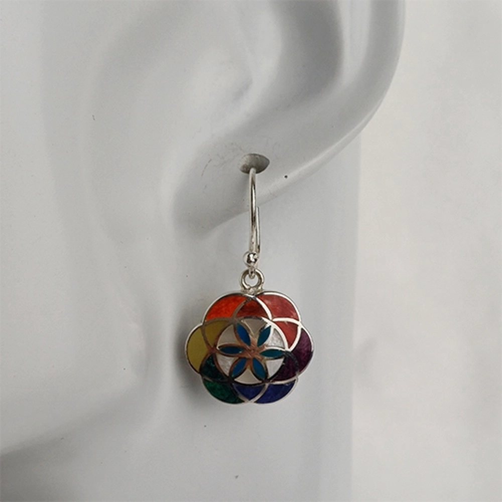 De Flower of Life Rainbow Oorbellen stralen kleurrijke harmonie uit en kunnen symbool staan voor verbondenheid en groei. Het ontwerp combineert levendige regenboogkleuren met een spirituele betekenis die vaak wordt geassocieerd met het universum en het leven. Perfect voor wie een betekenisvol en kleurrijk accent zoekt.