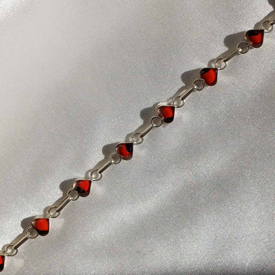 Een delicaat sieraad, zorgvuldig met de hand vervaardigd van 950 zilver en bezet met kostbare edelstenen.